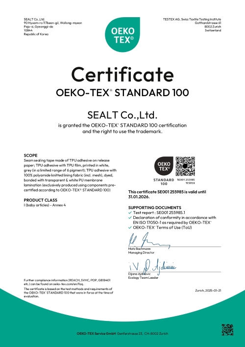 OEKO-TEX STANDARD 100 OEKO-TEX Standard 100은 유럽 친환경 섬유품질인증으로 섬유제품에 대한 세계적인 유해물질 안정성 인증입니다.이 인증은 인체에 영향을 미칠 수 있는 100여개의 항목에 대한 테스트를 통과해야 하며, 원재료부터 완제품까지 전체 생산 단계에서 안정성 및 품질에 대한 철저한 검토가 이루어집니다. 이전글 품목별 원산지인증수출자 인증서 다음글 ISO 45001 목록